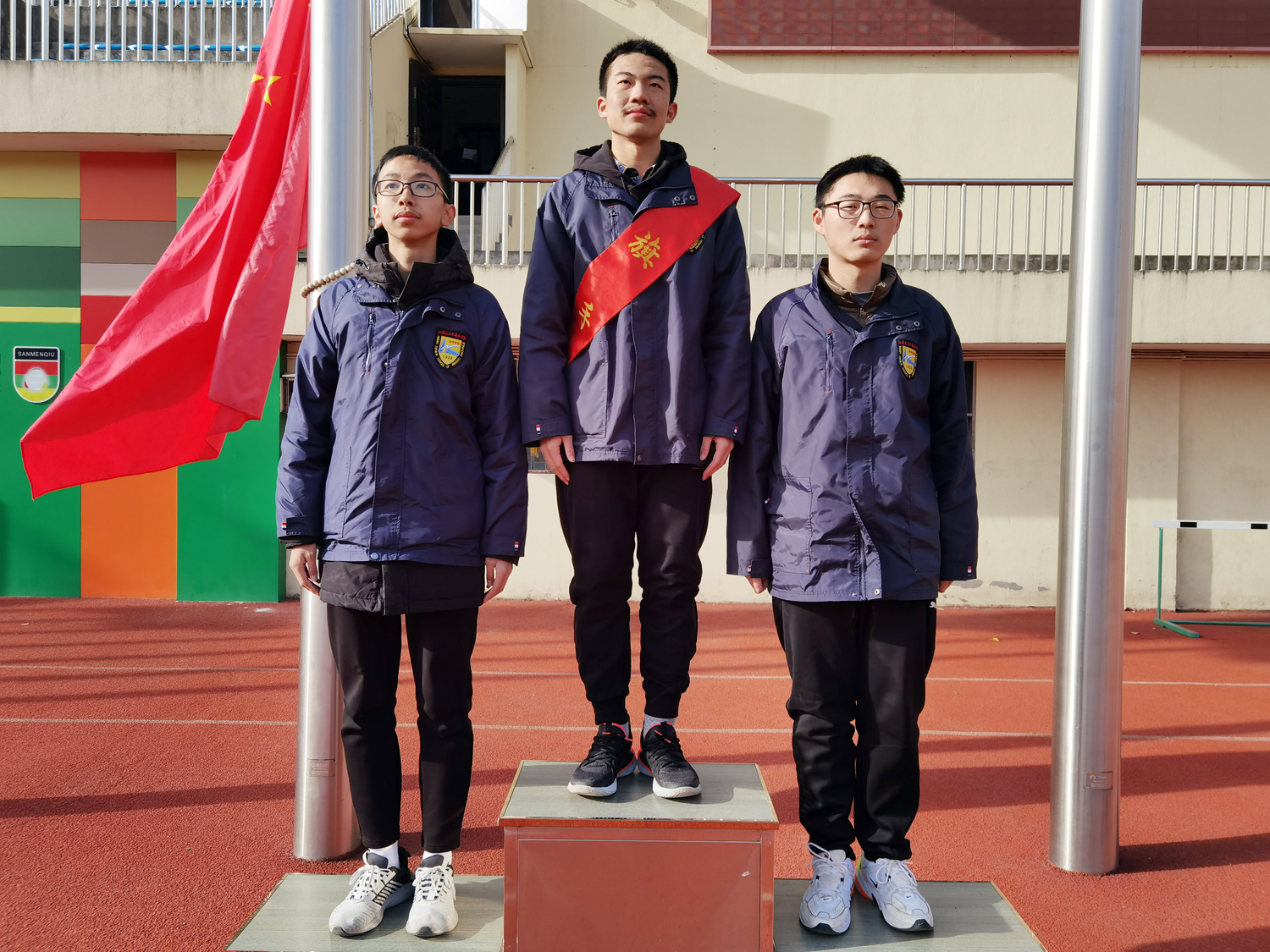 今天的旗手是来自高三(8)班的班长杨淦博同学。他勤奋学习,成绩优异,各门学科均衡发展,名列前茅;他不畏困难,刻苦钻研,参加全国中学生数学、物理竞赛均获得过省一等奖的好成绩;作为班长,他协助老师带领高三(8)班的同学们创造良好的学习氛围,帮助同学答疑解惑,共同进步。今天,距踏上2022年高考战场还有197天,他希望与高三的同学们一起策马扬鞭,枕戈待旦,越战越勇,拼搏出自己的灿烂明天!无愧高三!无悔青春!旗手介绍完毕。