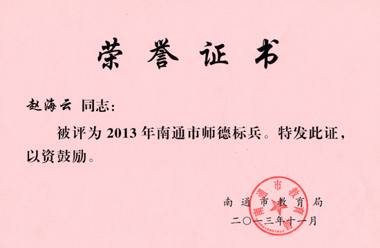 我校赵海云老师被评为“2013年南通市师德标兵”