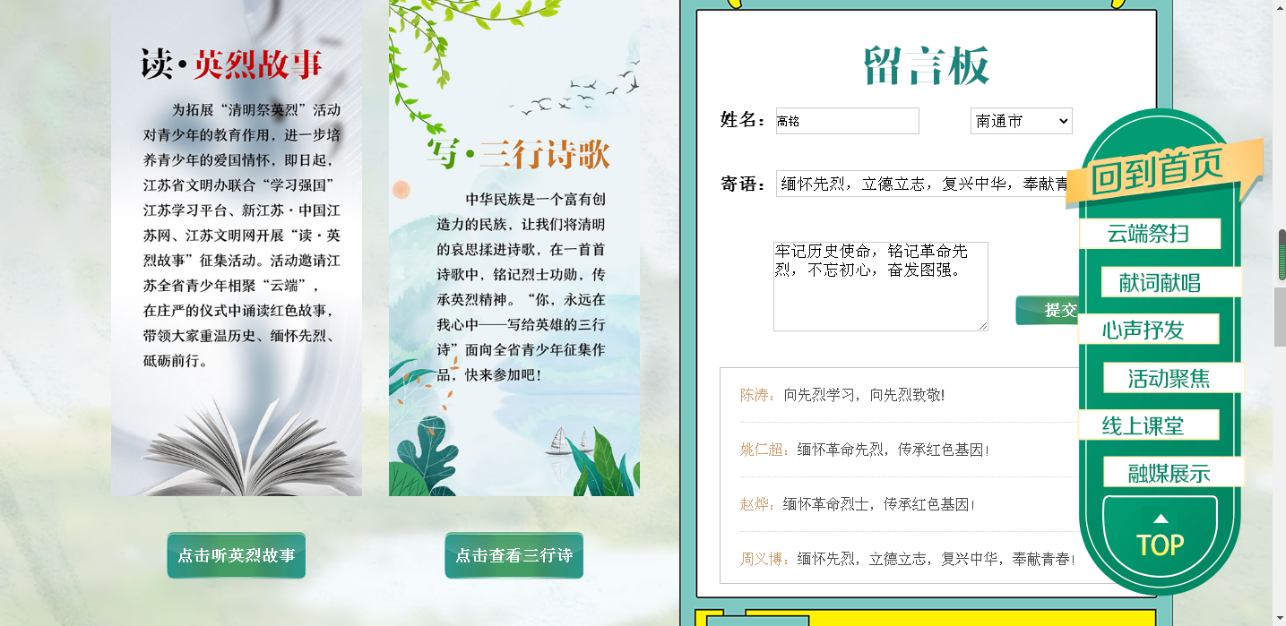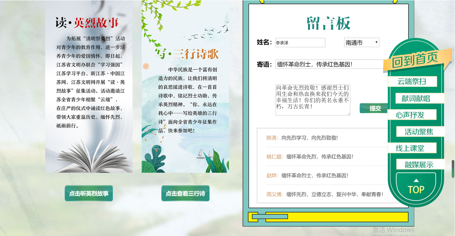 当下,疫情防控形势严峻,但灰色的阴霾阻挡不了我们对革命先烈诚挚的思念。清明前夕,我校德育处、团委向全校师生发出倡议,通过线上祭扫、云端追思的方式,缅怀革命先烈,致敬民族英雄师生们积极响应,纷纷录祭扫专题网页,以向烈士献花、发表留言寄语录制视频多种形式传递自己的思念与敬仰。网页上一句句发自心灵深处的留言,一支支点燃的烛火与放飞的白鸽将深切的缅怀捎至云端
