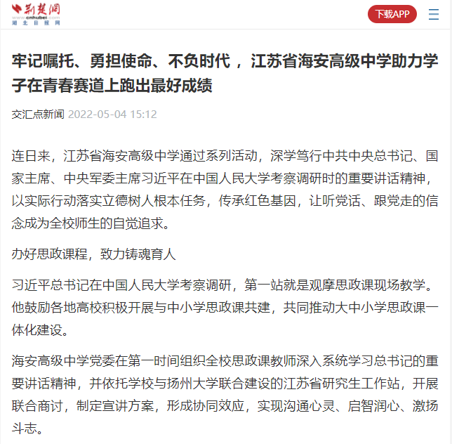 主流媒体聚焦海安中学深学笃行习近平总书记考察中国人民大学重要讲话精神系列活动