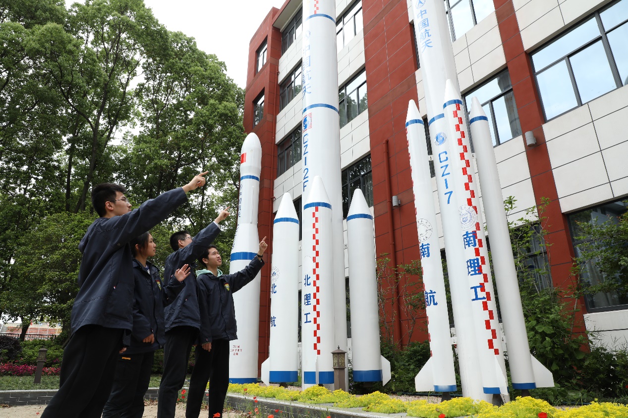 “我爱祖国的碧海蓝天”航母造型雕塑、四枚蓄势待发的运载火箭模型吸引诸多学子前来“打卡”,国防园内用于飞行员体能训练的浪木、滚轮、旋梯等训练器械也吸引着学生去一展身手,园内“国防七子”的介绍牌潜移默化地在学子心中激发起投身国防事业的家国情怀。
