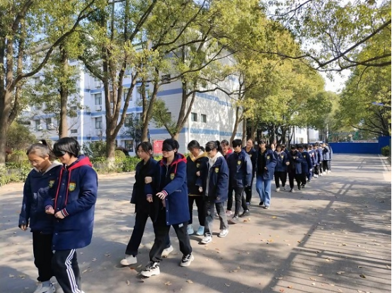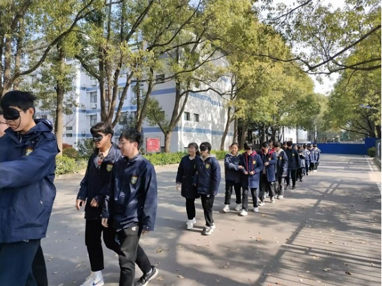 活动开始,心理老师对学生进行了排序分组,相邻两位同学作为搭档,一位戴上眼罩扮演“盲人”,另一位扮演不说话的拐杖。通过非言语信息帮助盲人穿越障碍,体验互助、信任、责任意识。