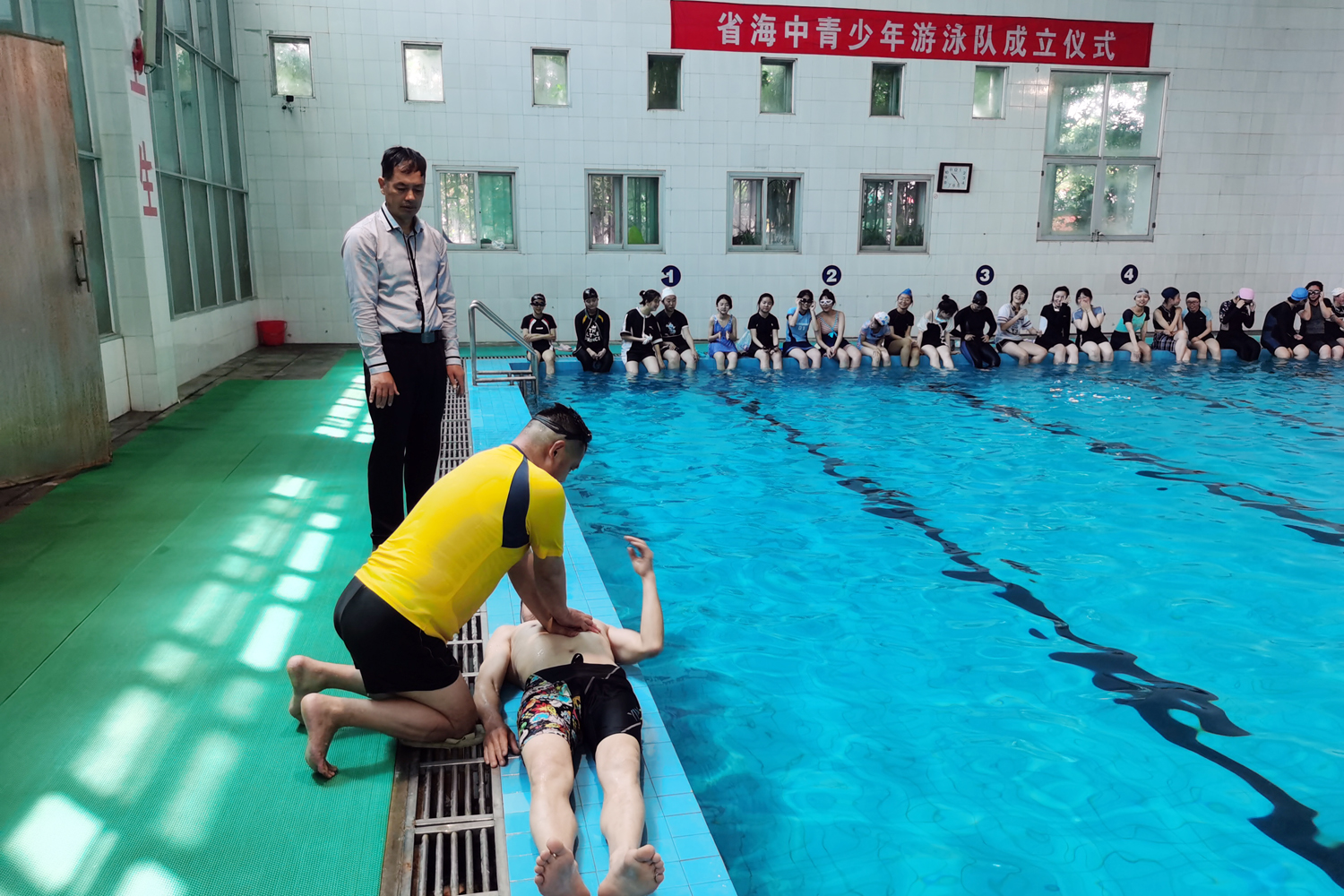 学校游泳馆救生员老师从专业角度详细讲解了救生用具的正确使用方法,并讲授了抽筋、呛水等意外发生时的相关救生知识。随后,救生员老师组织学生认真学习了泳池观察和防护、水下缠抱救助、运送溺水者及心肺复苏等技能,并进行了实战演练。