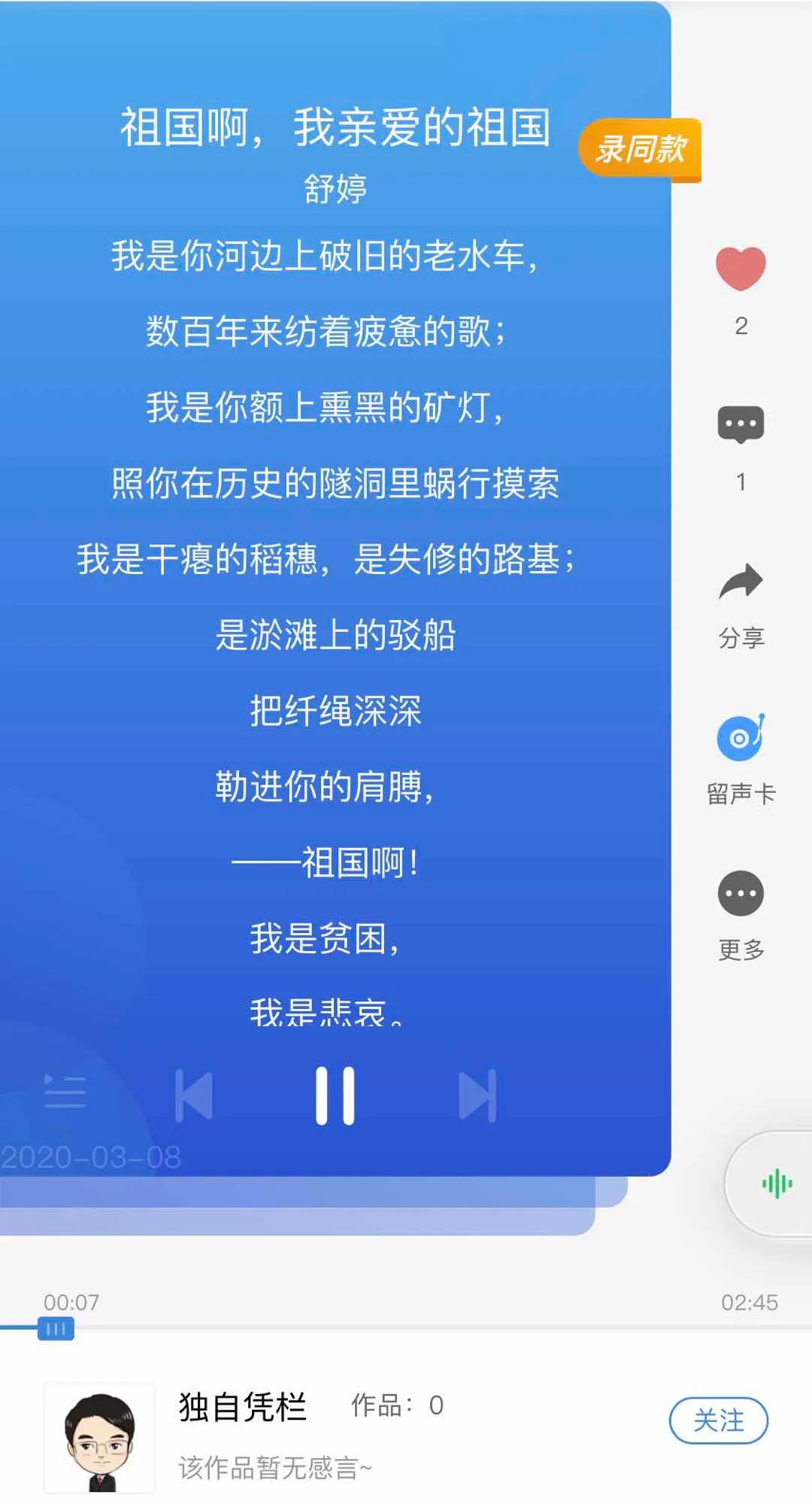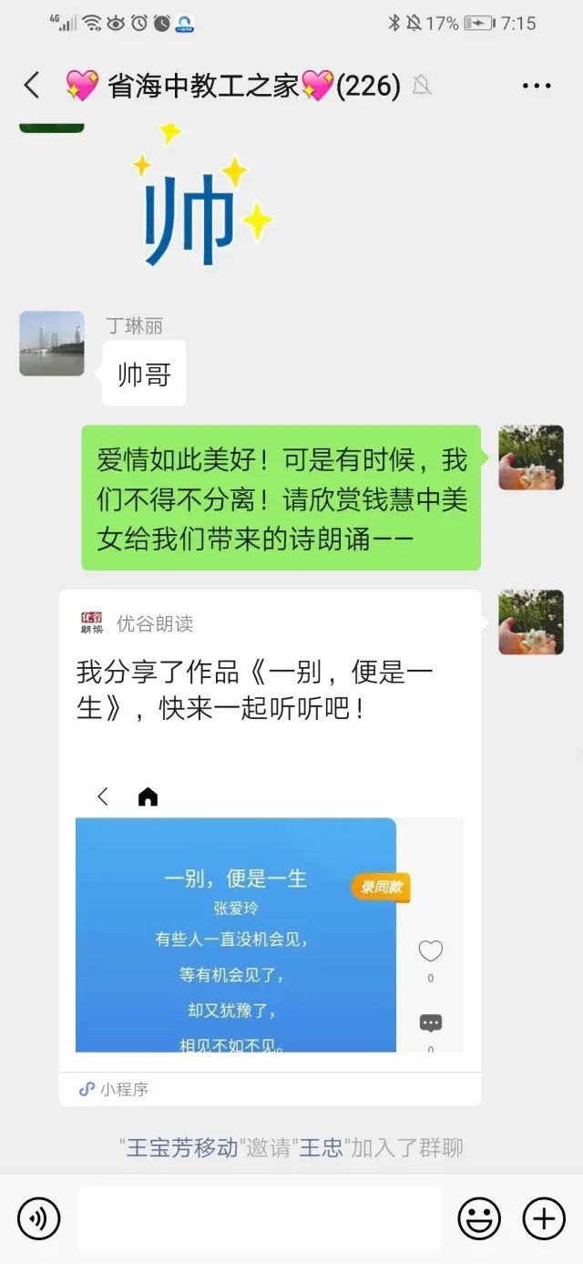 朗诵大会历时三个半小时,共为教职工们呈现了深情并茂的朗诵作品28件。教职工们朗诵的作品既有流传千古的诗词名篇《江城子》《蜀道难》《沁园春.长沙》等,也有经典现代诗《再别康桥》《致橡树》《写给母亲的诗》等,还有为抗击新冠肺炎疫情而作的抗疫诗《眼睛》《我相信》《这个春天很冷》《热爱生命》等。活动开展过程中,教职工们热情响应、积极参与,不少同志在欣赏朗诵作品后发表线上感言:“今天的活动真棒!热情洋溢!大饱耳福!” “听得激动,朗诵得好好啊。睡不着了!” “听着朗诵改试卷,仿佛试卷都变得可爱起来!”......