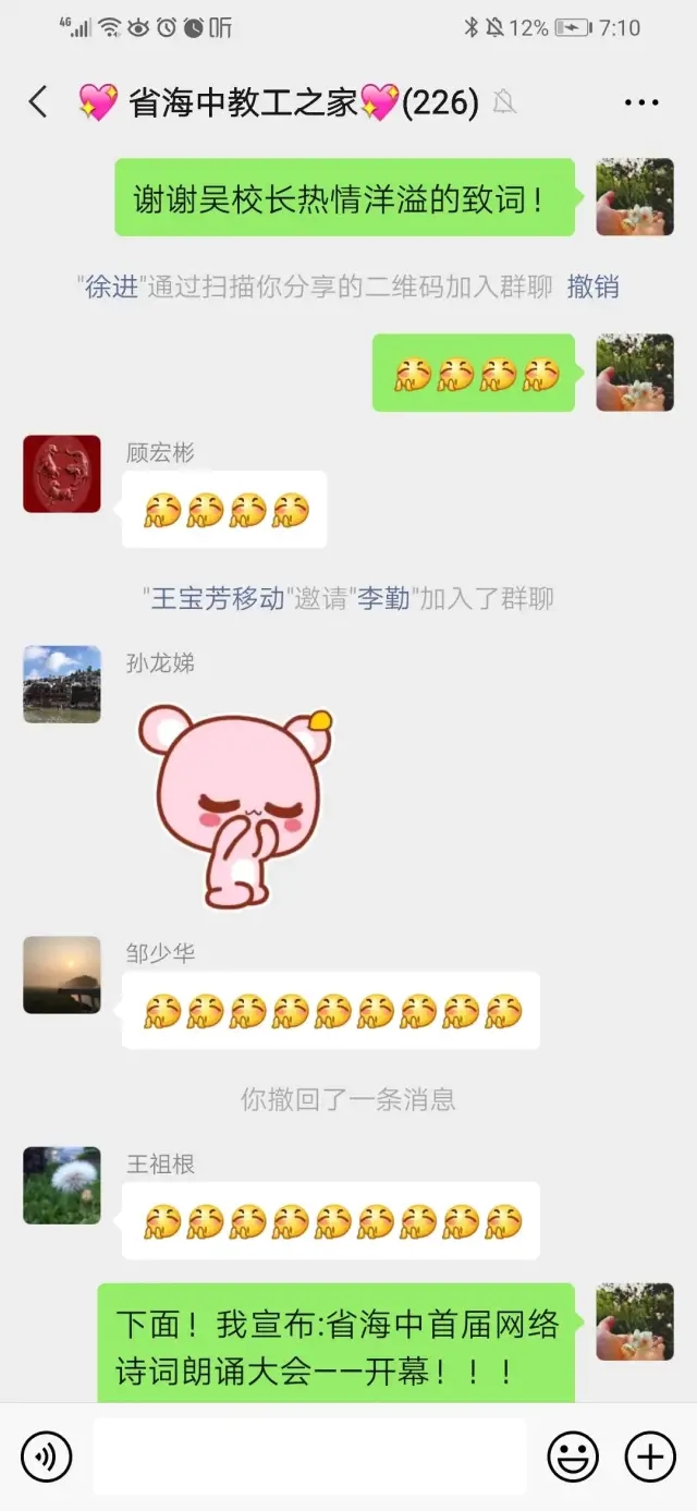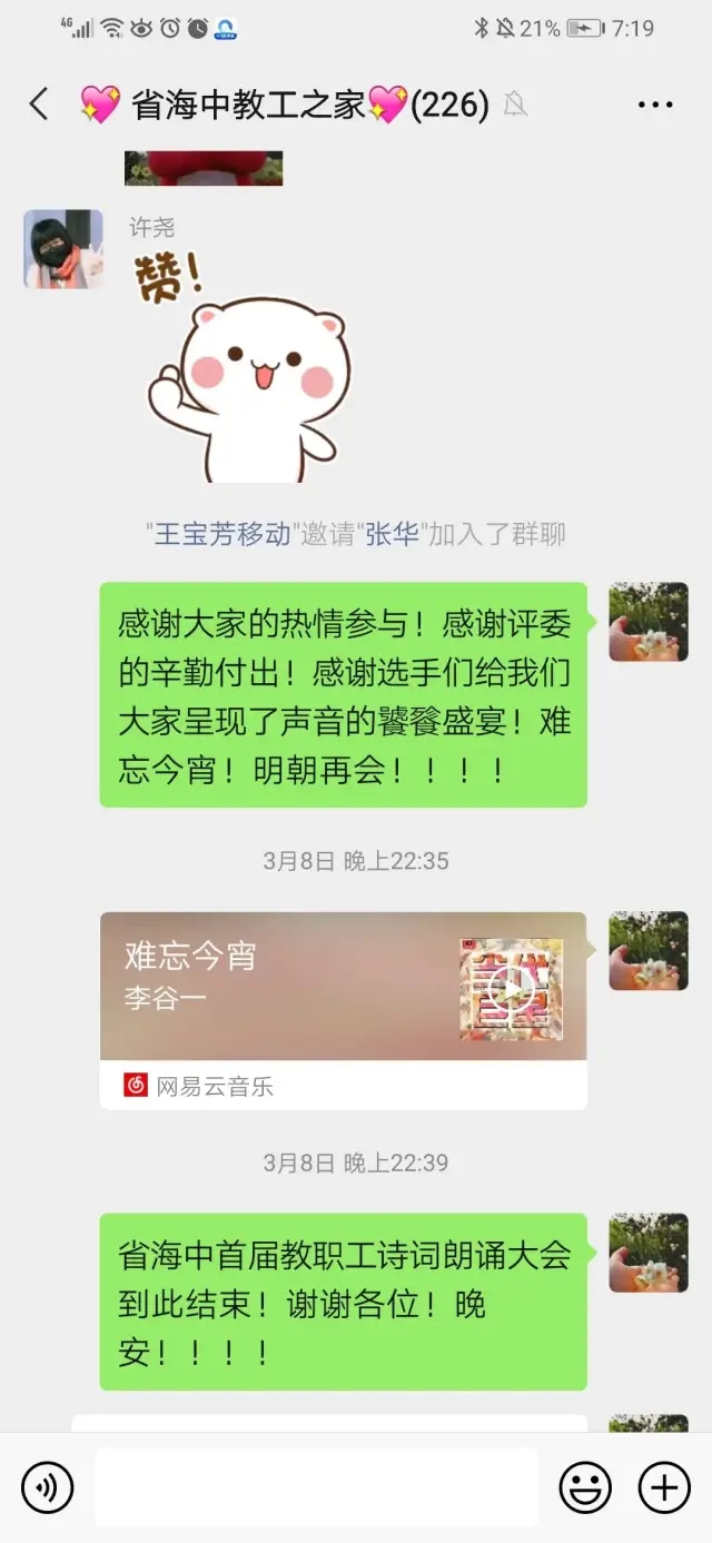 省海中线上诗词朗诵大会的成功举行,丰富了教职工的文化生活;鼓舞了教职工抗疫必胜的信心和士气,提高了教职工的审美情趣,促进了教职工不断学习,树立终身学习的理念。