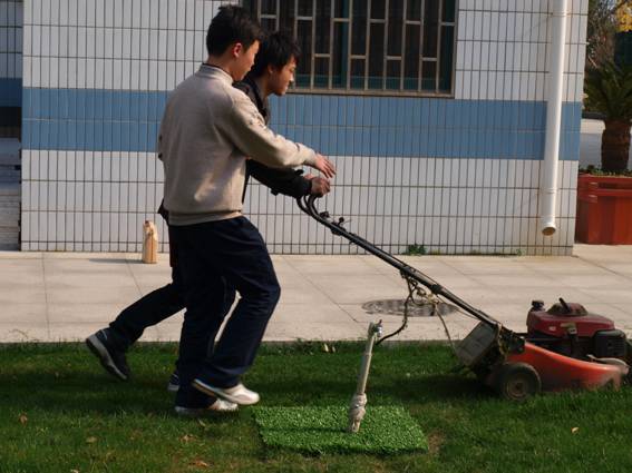 男生抢着帮忙修剪学校的草坪