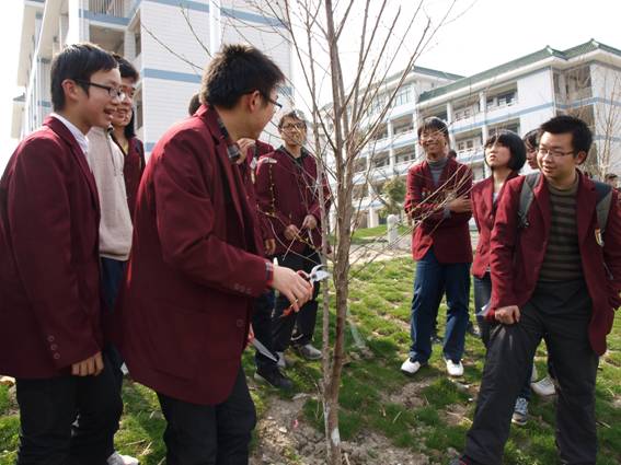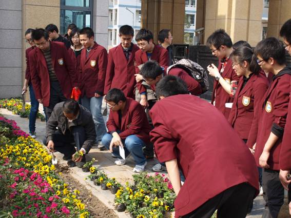 我校园丁吉凌峰向学生讲解花草移栽技巧