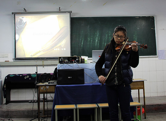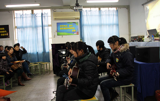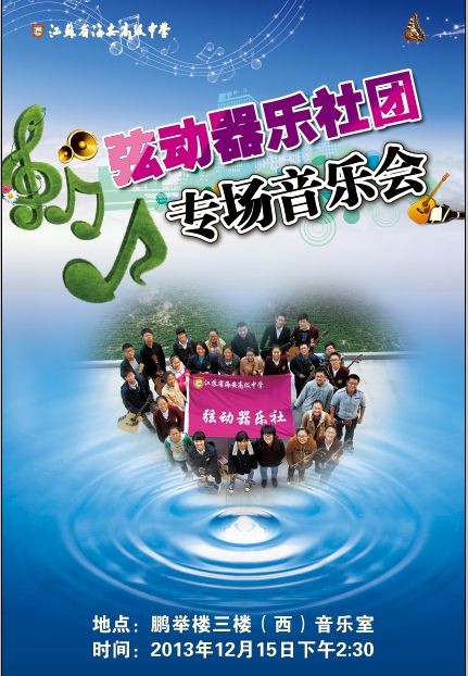 2013年12月15日下午两点半在我校鹏举楼三楼音乐室,一场“营造健康高雅校园文化,弘扬校园文明主旋律”为主题的校园音乐会在此拉开帷幕。这是海中弦动器乐社团自成立以来举办的首届器乐专场音乐会。