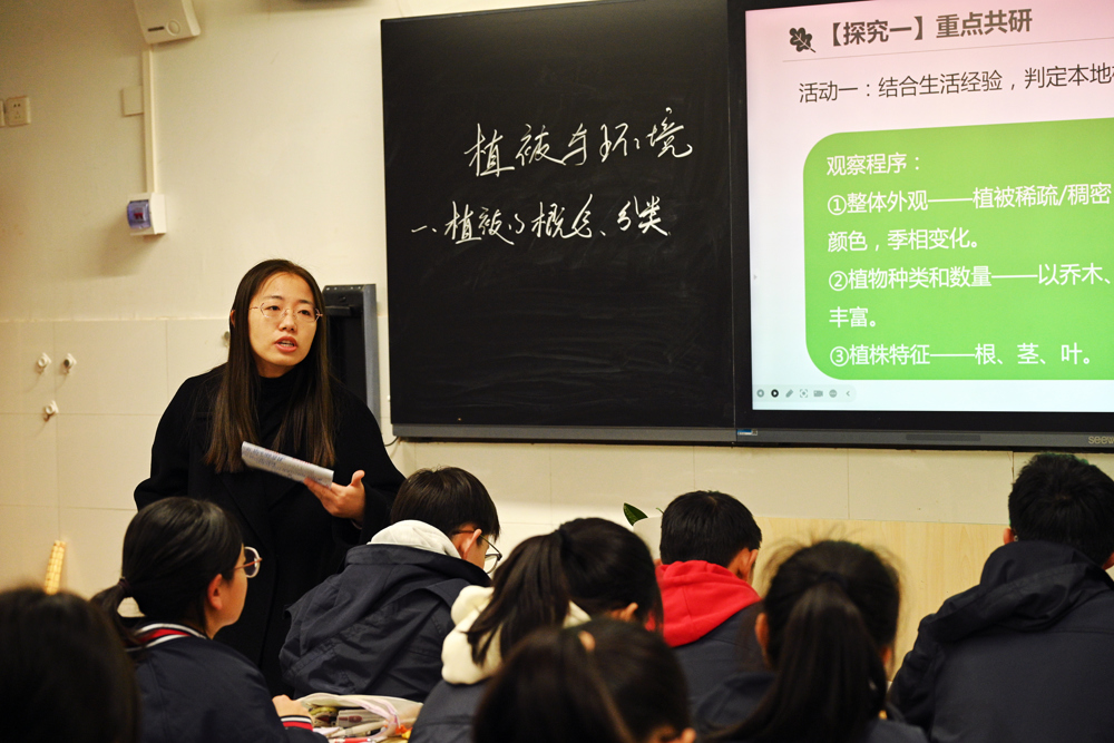 蔡璐老师执教的新授课《植被与环境》以生活中的本地植被导入新课,注重教材的开发重组,紧密联系生活中的地理,通过向学生展示各种植物的实物及图片,增强学生感官认识,培养学生理性思维,通过对比不同区域树叶、树根、树干与环境的特点,深化学生区域认知,培养学生综合思维;王缪鹏老师执教的一轮复习课《资源跨区域调配对区域发展影响》以“南水北调”“中俄天然气管道铺设”为例,采用问题牵引的方式推进教学,精心架设探究路径,提升学生思维能力,关注学生表现型评价,促进地理核心素养生成。
