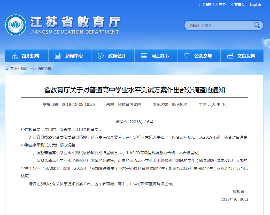 为认真贯彻落实省委常委会议精神,适应高考改革要求,在广泛征求意见的基础上,经省政府批准,从2019年起,我省对普通高中学业水平测试方案作部分调整: